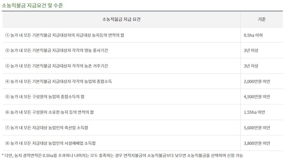 - 소농직불금 : 일정 요건(개인 경작면적, 농가 소유면적, 영농 종사기간, 농촌 거주기간, 농외소득 등)을 모두 충족하는 농가에 면적과 관계없이 130만 원을 지급