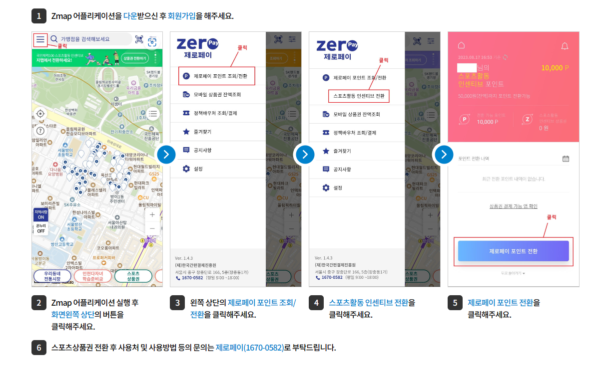 ✅ ZMAP 다운 및 회원가입 > 앱 실행 후 화면왼쪽 상단 버튼 클릭 > 왼쪽 상단 제로페이 포인트조회/전환 클릭 > 스포츠활동 인센티브전환 클릭 > 제로페이 포인트 전환 클릭
