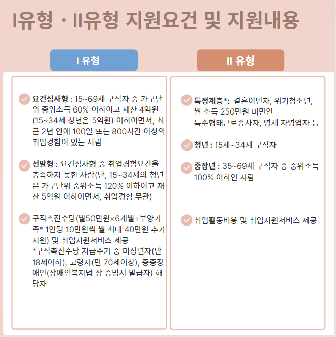 참여자의 소득과 재산 등에 따라 두 가지 지원 유형으로 나뉘게 되며 유형에 따라 수당도 다릅니다.