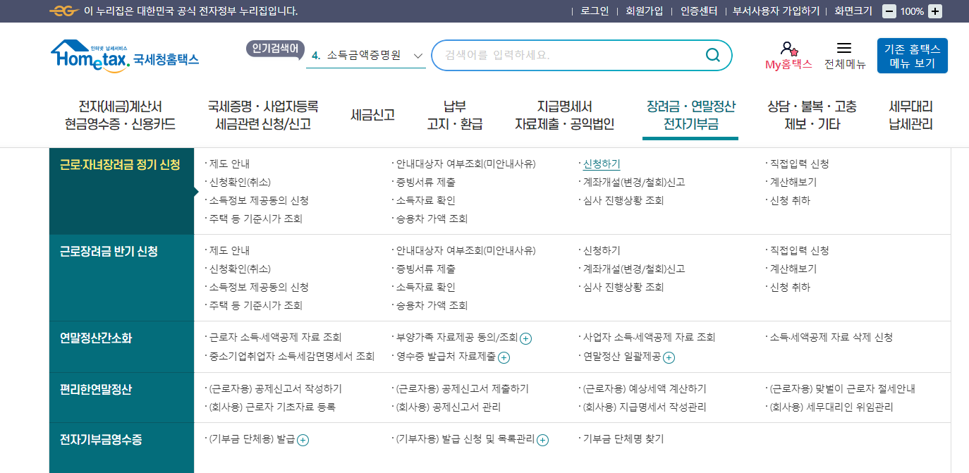 - 온라인 : 홈텍스 홈페이지 접속 → 로그인 → 장려금 ·연말정산 전자기부금 → 근로 ·자녀장려금 정기신청 → 신청하기
