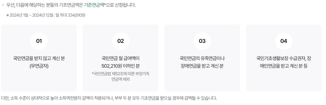 - 2024년 기초연금 선정기준액 : 월 2,130,000원(단독가구), 월 3,408,000원(부부가구)