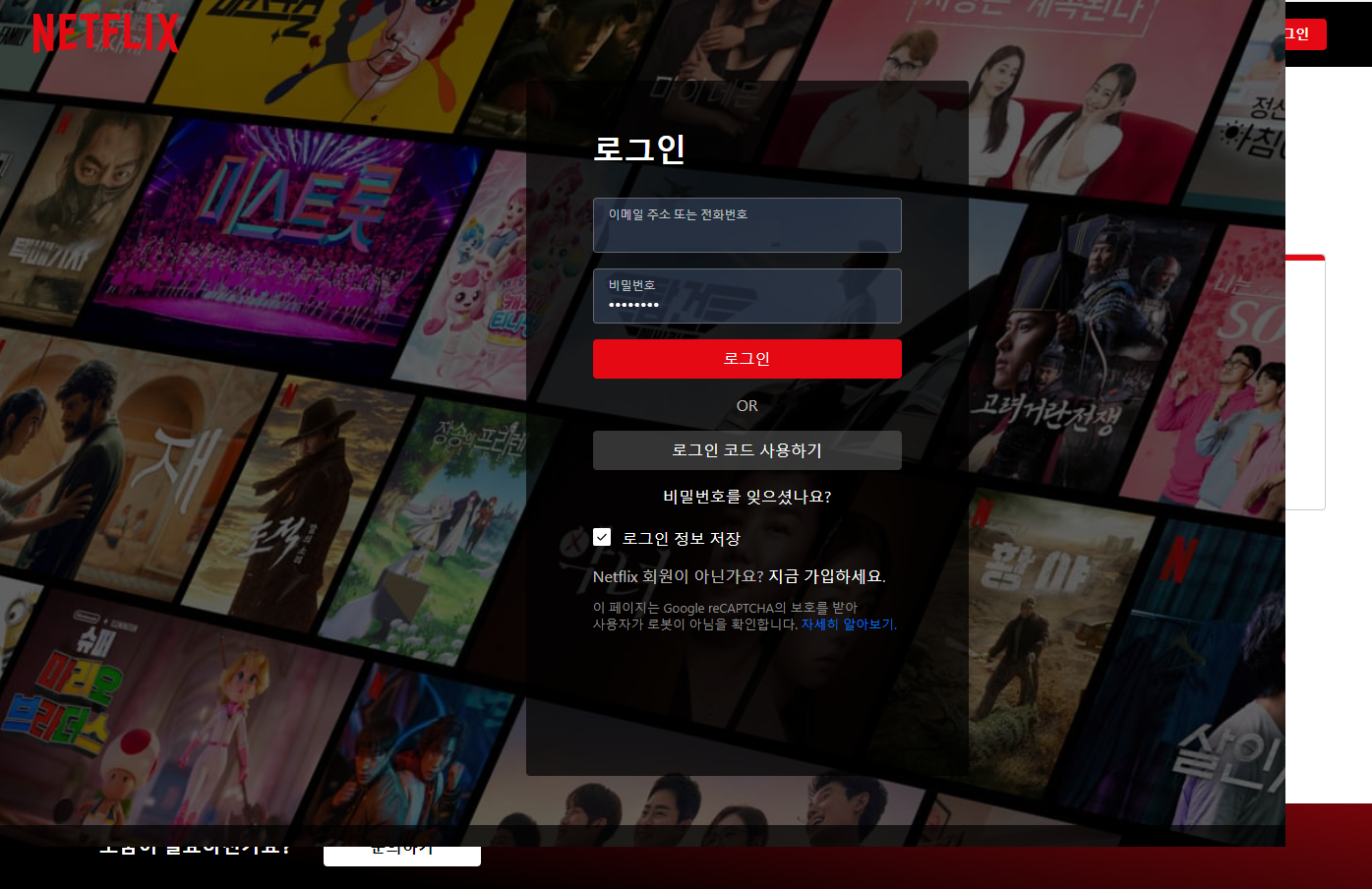 위 사진에 넷플릭스 계정을 해지 클릭을 하시면 로그인 창이 뜹니다. 계정정보 입력 후 로그인을 하시면 해지나 재신청화면으로 이동됩니다.