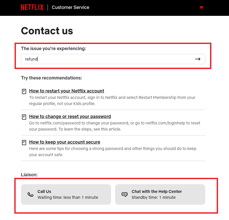넷플릭스는 환불 받는 방법이 어렵게 되어있습니다. 따로 환불 페이지가 존재 하는것이 아니고, 고객센터에 전화 또는 라이브챗으로 요청 할 수 있습니다. 한국어 버전에서는 문의 전화로 가능하고, 영어 버전에서는 라이브챗도 가능합니다.