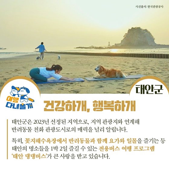 ✅ 반려동물 동반 가능 레저 활동 제공 (예: 태안 댕댕버스)