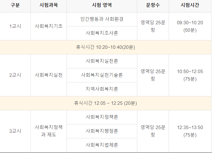 시험은 매년 1회 실시되며, 필기시험으로 진행됩니다. 시험과목은 총 3과목으로, 사회복지기초(30문항), 사회복지실천(75문항), 사회복지정책과 제도(75문항)입니다. 각 과목당 40% 이상 득점하고 전 과목 총점의 60% 이상 득점한 경우 합격하며, 합격자 발표 이후 한국사회복지사협회에 자격증 발급 신청을 하면 자격증을 취득할 수 있습니다.