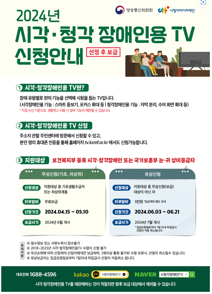 방송통신위원회와 시청자미디어재단에서 스마트 돋보기, 포커스 확대, 자막 분리, 수어 화면 확대 등의 기능을 갖춘 시각‧청각장애인용 TV를 보급하는 사업입니다.