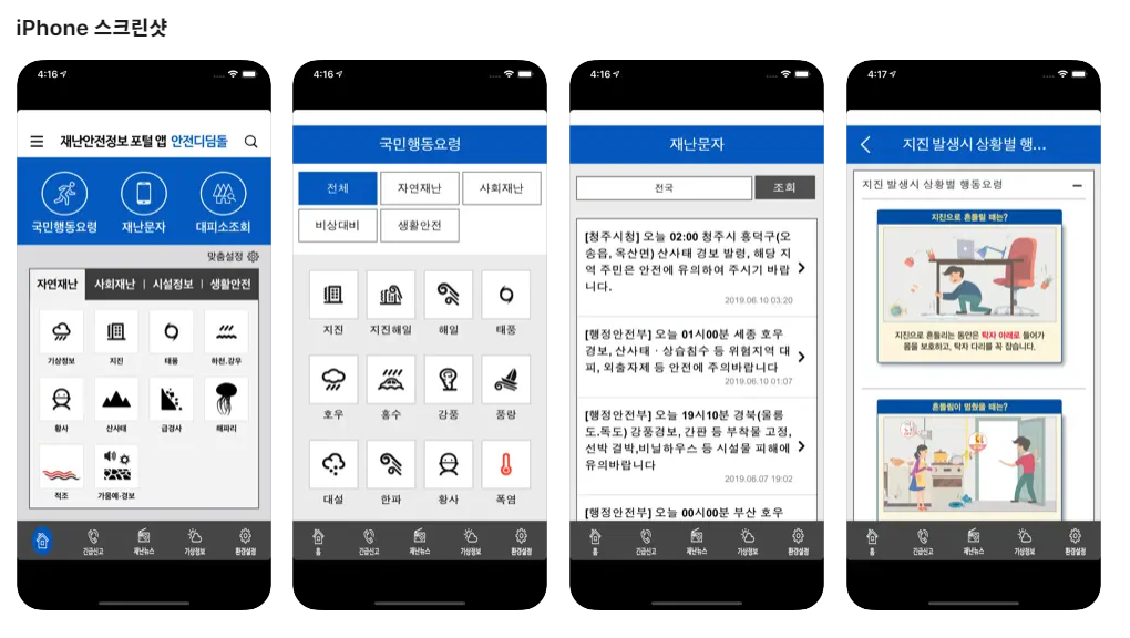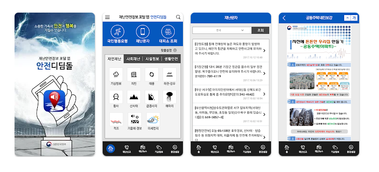 이뿐 아니라 119, 122 긴급신고,기상정보,병원,약국,대기오염 등 재난과 관련된 정보를 종합적으로 서비스 하고 있습니다.