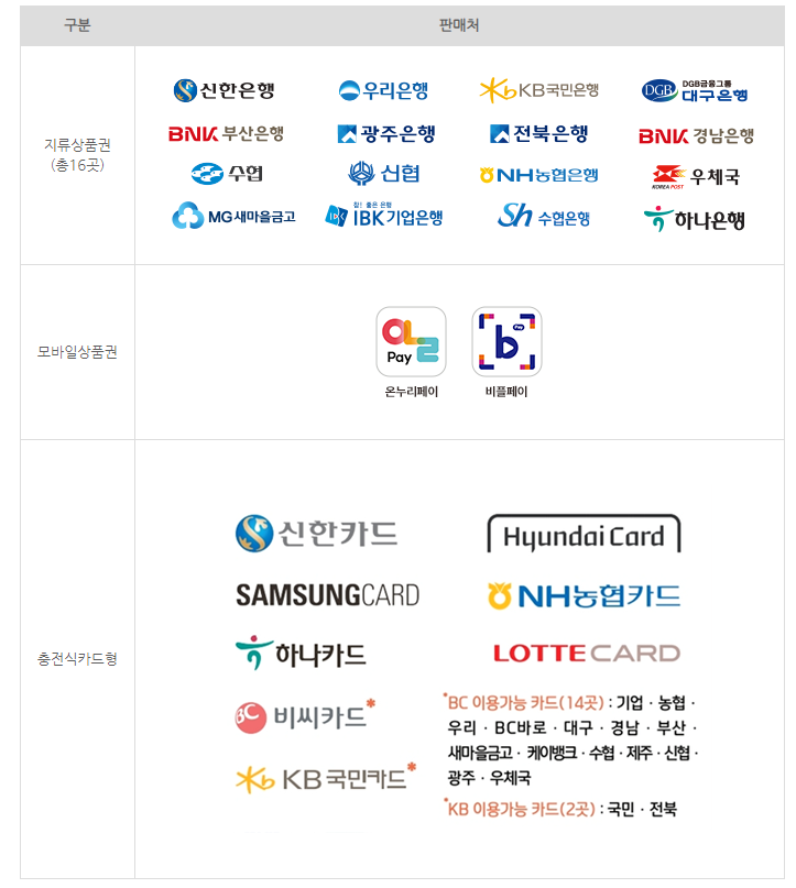 - 충전식카드형 상품권 : 5천원, 1만원, 3만원, 5만원, 10만원 구매 가능
