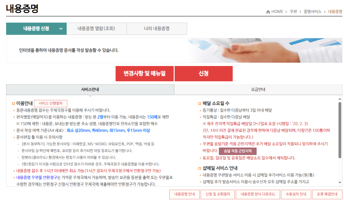 내용증명을 선택하면 아래와 같이 서비스 안내 및 요금안내를 확인할 수 있고, 우측 하단에서 내용증명 양식도 다운로드 받을 수 있습니다. 내용증명 양식을 다운로드 받아 작성 후 파일로 준비한 다음 첨부할 수도 있고, 직접 문서를 작성해 신청할 수도 있으니 여러분들이 편하신 방법으로 신청을 하시면 됩니다.