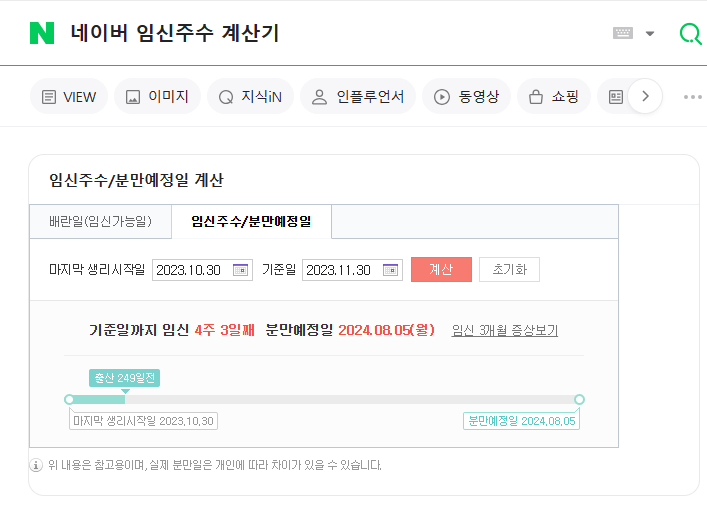 네이버에서 임신주수 계산기 또는 분만예정일을 검색하면 친절하게 자동으로 계산을 해줍니다.