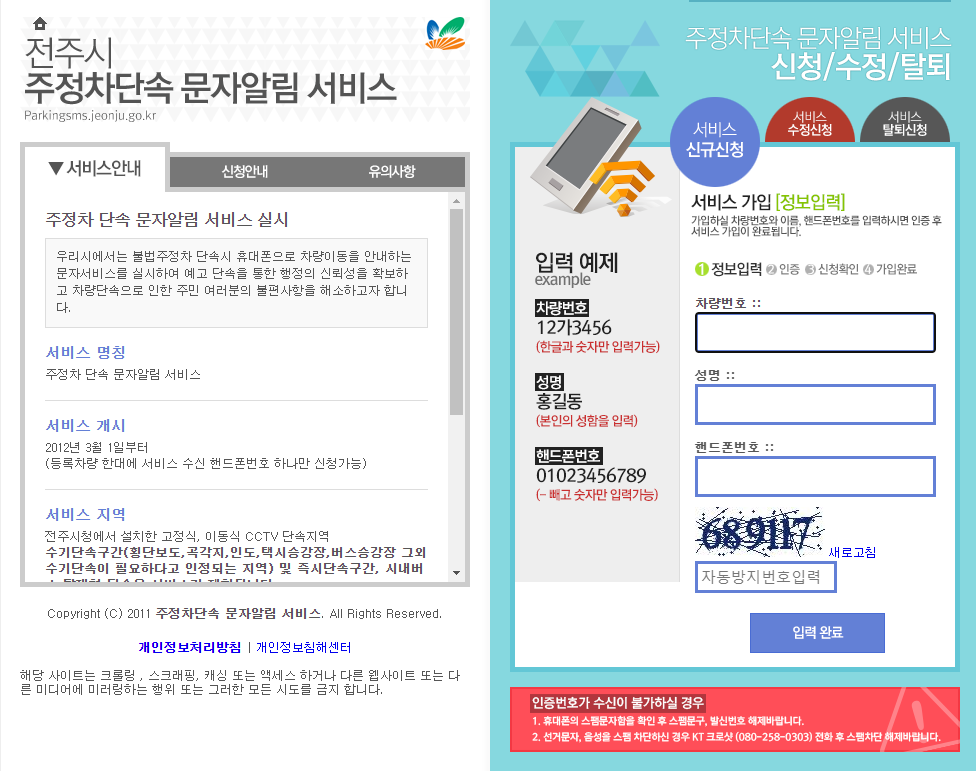 - 거주지역 주민센터 방문 → 주정차 단속 문자 알림 서비스 신청서 작성 → 제출