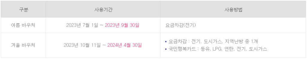 - 겨울 바우처 일부를 여름 바우처로 당겨쓸 수 있음(최대45천원,희망세대의 경우 바우처 신청 시 선택)