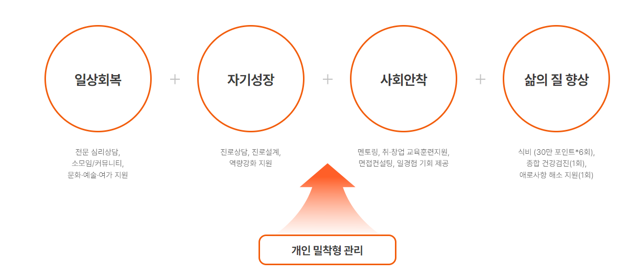 ✅ 사회안착 : 멘토링, 취·창업 교육훈련지원, 면접컨설팅, 일경험 기회 제공