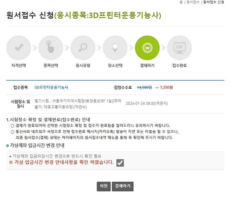 3. 응시료 50%지원 결과 확인 후 결제(신용카드, 실시간계좌이체, 가상계좌 등)