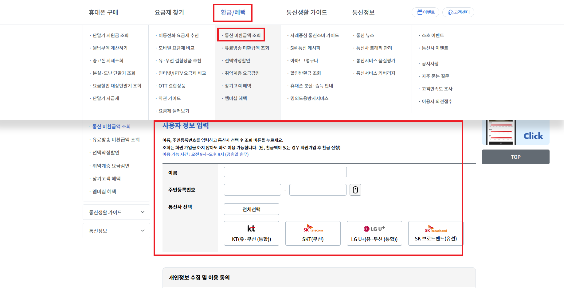 통신비 환급금 조회 : 과거 지불한 통신비 중 환급받을 수 있는 금액이 있는지 확인할 수 있습니다.