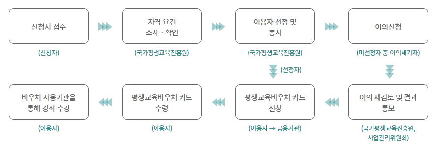 📍 이용절차 : 평생교육바우처 신청 → 자격심사 → 이용자 선정 → 카드 발급 신청, 수령 → 평생교육바우처 사용기관 및 강좌 검색 → 강좌 신청 및 수강 → 수강 결과 확인 → 이용 완료