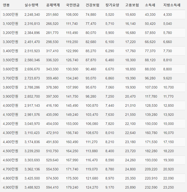2024년 연봉 실수령액 표