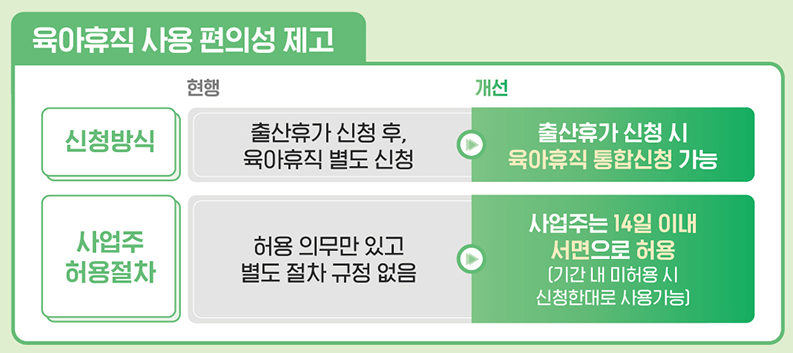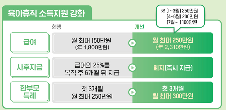- 아빠육아휴직보너스제 통합 : 현재는 부모가 순차적으로 육아휴직을 사용할 경우 두 번째 사용자에게 통상임금의 100%(상한액 250만원)를 지급하는 아빠육아휴직보너스제를 운영하고 있으나, 2025년부터는 육아휴직급여 소득대체율 인상에 따라 아빠육아휴직보너스제를 육아휴직급여에 통합하여 운영합니다.