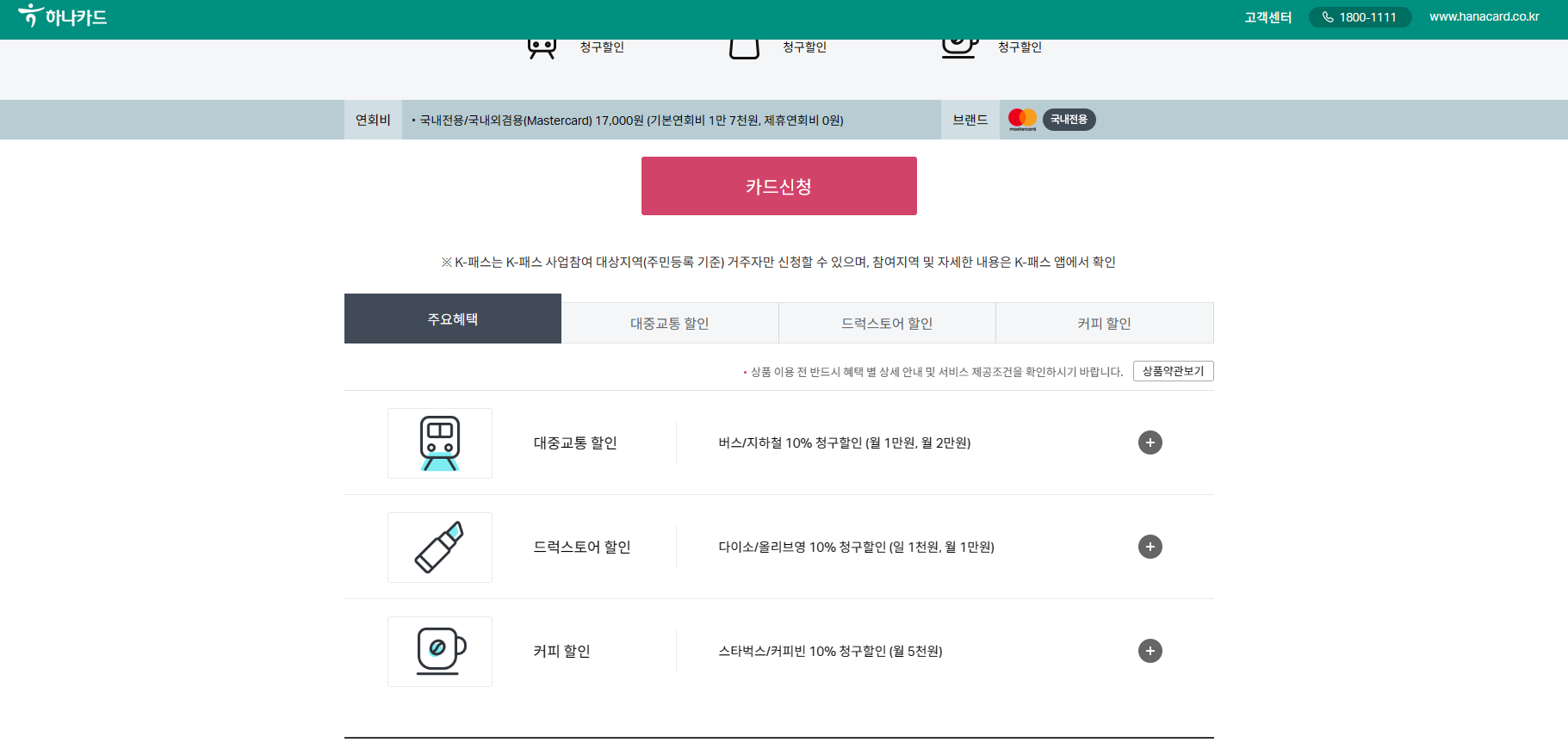 하나 K패스 신용카드는 대중교통 10%, 드럭스토어 10% 청구 할인이 있는데, 드럭스토어는 올리브영과 다이소에서 10%를 할인을 받을 수 있는 카드 입니다. 대신 실적별 할인 한도가 적용되어 전월 50만 원 이상 사용해야 할인을 받으실 수 있기 때문에 올리브영이나 다이소를 많이 이용하시는 분들이라면 하나 K패스 카드를 추천합니다.