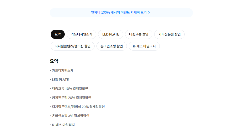 출퇴근 영역 대중교통 10% 청구 할인, 온라인 쇼핑몰 할인, 편의점, 커피전문점, 대중교통 (시내버스, 지하철, 택시), 도서의 혜택이 있어서 신한하고 비슷하지만 약간 다른 영역이 있어 위를 잘 고려하여 선택을 해주시면 될 것이라 생각합니다.